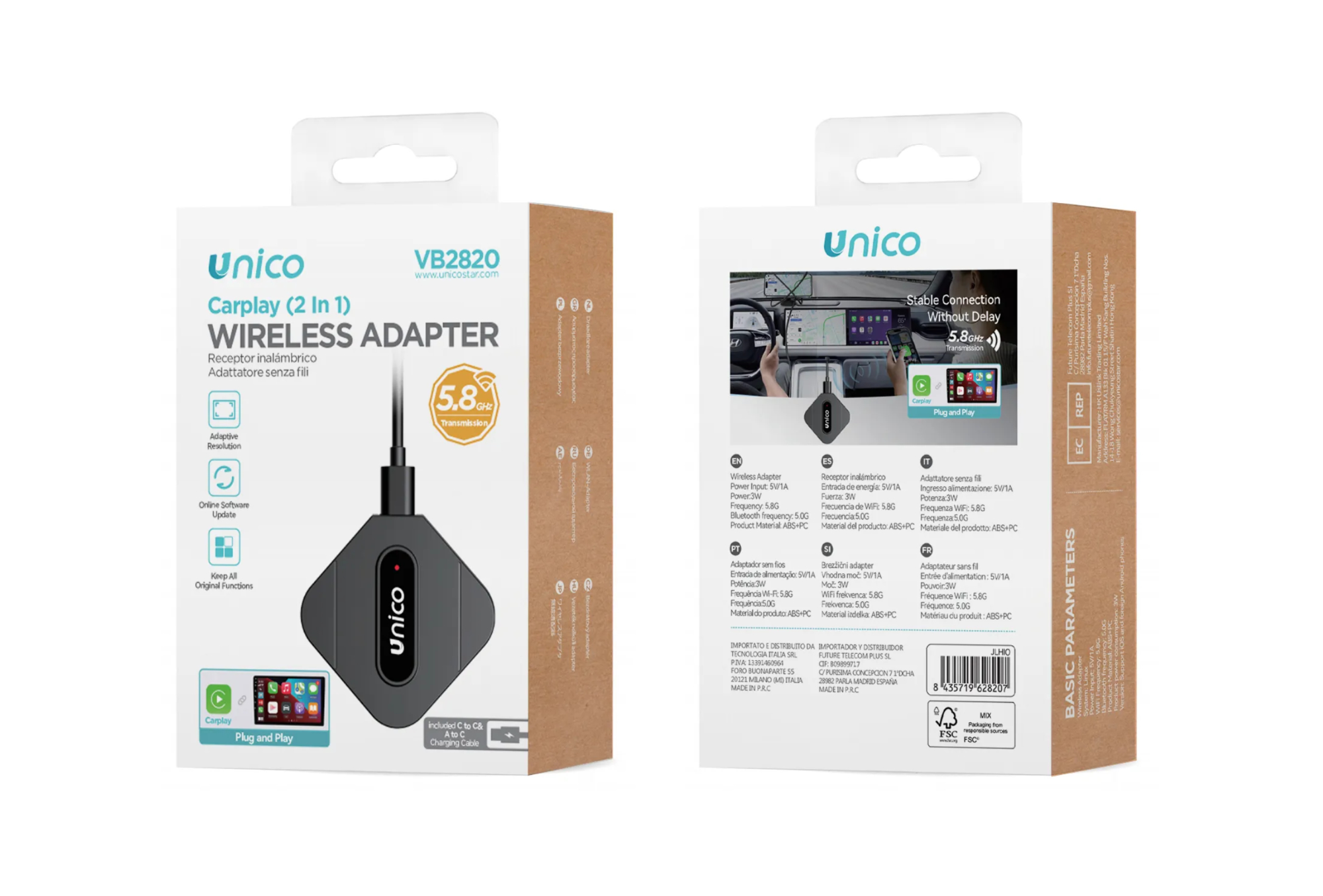 Questo piccolo dispositivo consente di utilizzare Apple carplay e android auto in auto in modalità wireless anzichè in modalità via cavo. Collegandolo infatti alla propria automobile (che supporta Android auto/Carplay), si connetterà allo smartphone tramite connessione a 5,8GHz in alta velocità e con bassissima latenza. Nella confezione sono inclusi 2 cavi USB: A-C e C-C per adattarsi ad ogni automobile. Gli aggiornamenti sono OTA e le funzioni originali dell’automobile sono comunque mantenute.