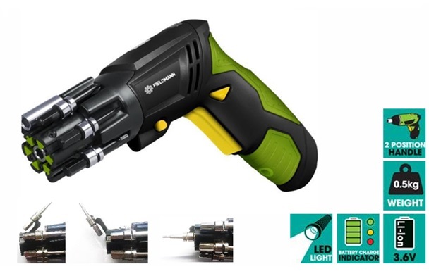 Principali specifiche tecniche: – Batteria agli ioni di litio da 3,6 /1300 mAh – Impugnatura girevole – 2 posizioni Interruttore direzione rotazione – Luce a LED per illuminare la zona di lavoro – LED Indicatore batteria – Tempo di ricarica: 3-5 ore – Peso: 0,49 kg