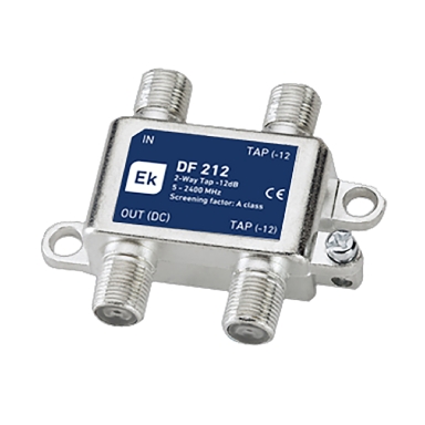 Derivatore classe A 2 uscite. Banda passante: 5-2400 MHz. Attenuazione di derivazione: 12dB. Perdite di passaggio: 2,8dB (862 MHz) / 3,5dB (2300 MHz). Passaggio DC sulla linea principale