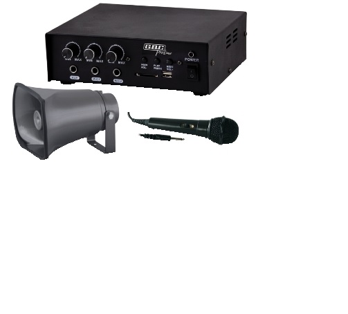 Corredato di un diffusore a tromba da 25W/8O e di microfono dinamico 600 ohm.