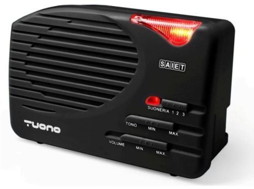 Suoneria elettronica extra amplificata con indicatore luminoso; 95dB; ampio indicatore luminoso; regolazione volume; regolazione tonalità e ritmo; fissaggio a parete.